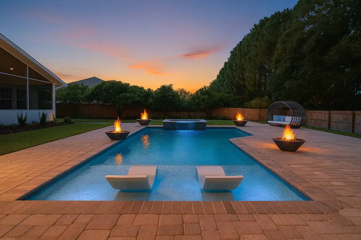 - Pool waterfalls that create a relaxing, resort-style effect or pool fountains that add motion and visual interest.